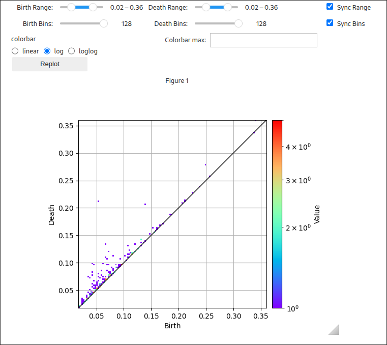 Birth Range、Death Range のスライダーでパーシステンス図のXYの範囲を、Birth bins、Death binsのスライダーでビンの数を指定します。 右側の Sync のチェックボックスをオンにすると、DeathがBirthの変更に同期するようになります (逆向きには同期しません)。 スライダーの右側の数字を直接キーボードから変更することもできます。 colorbar は3種類のカラーバーの方式を選ぶことができるようにします。 Colorbar max でカラーバーの最大値を指定できるようにします。 Replotボタンを押すと、これらの変更点が反映されます。